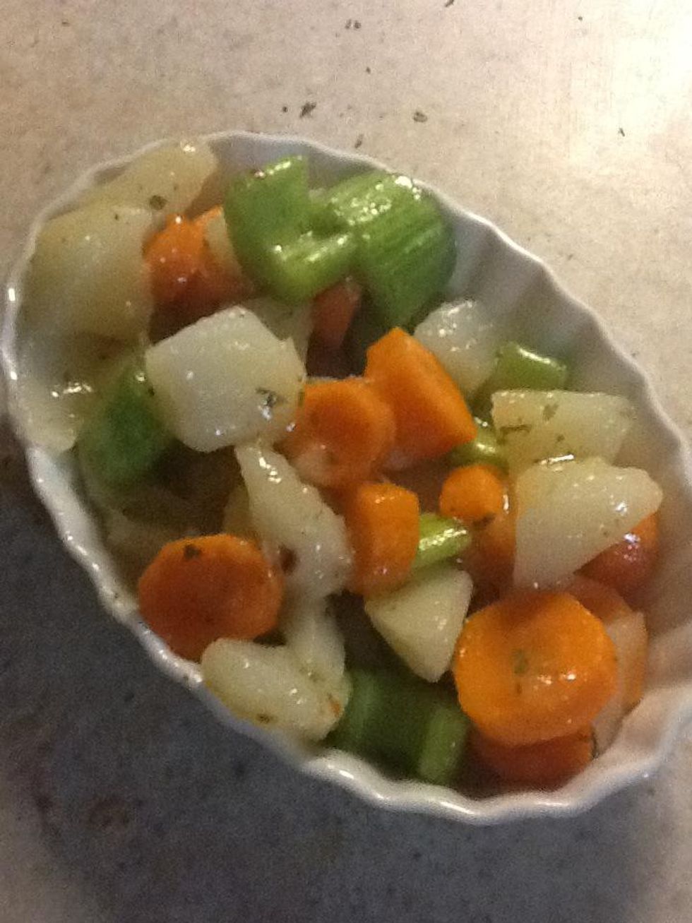 While waiting for the potato, peel and chop the carrot, and chop the celery.