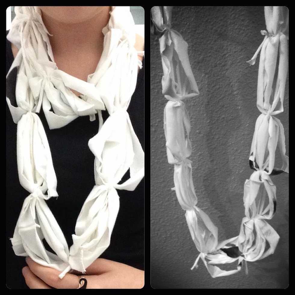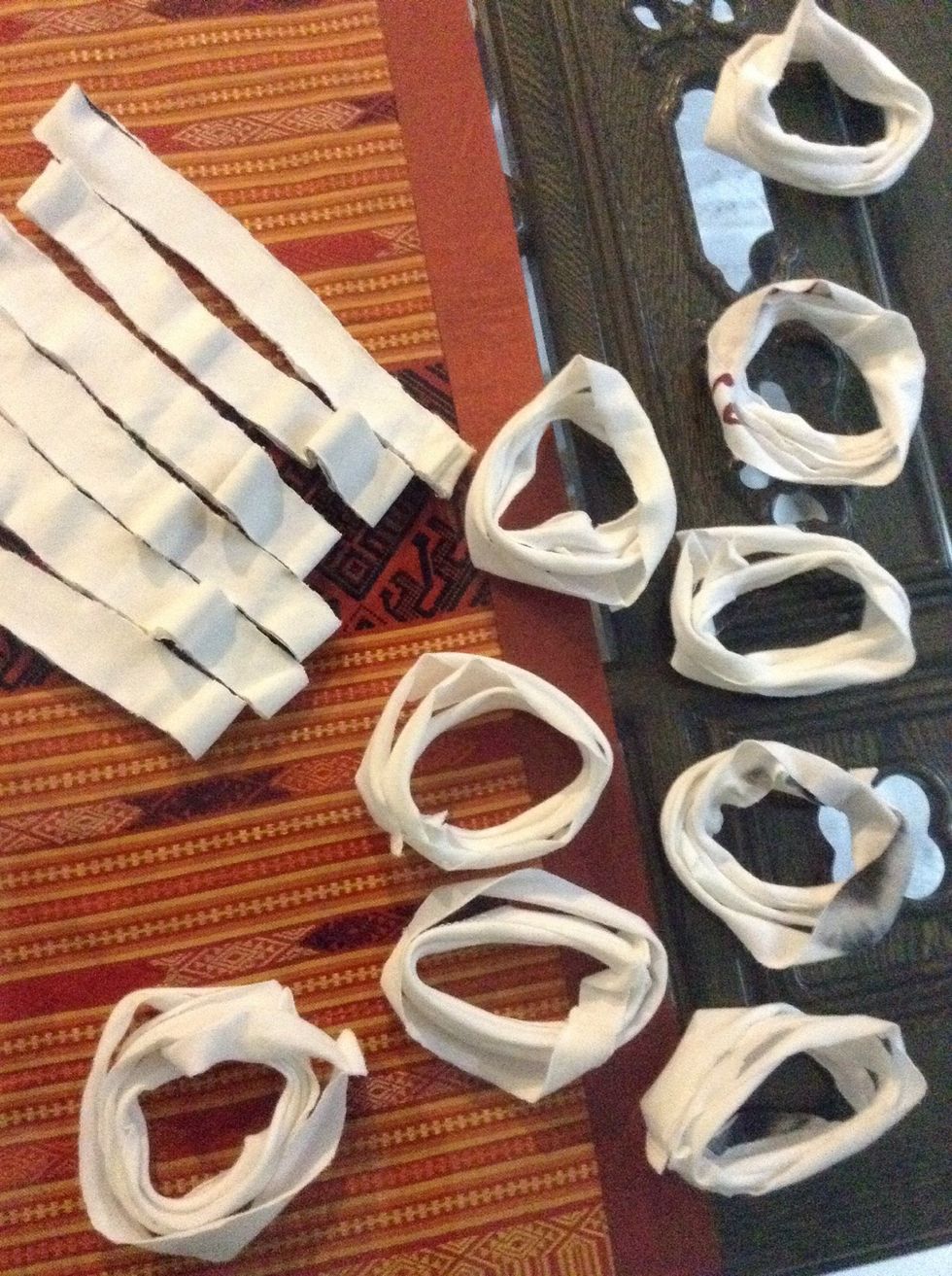 Now cut out small strings of fabric and tie two rings together.