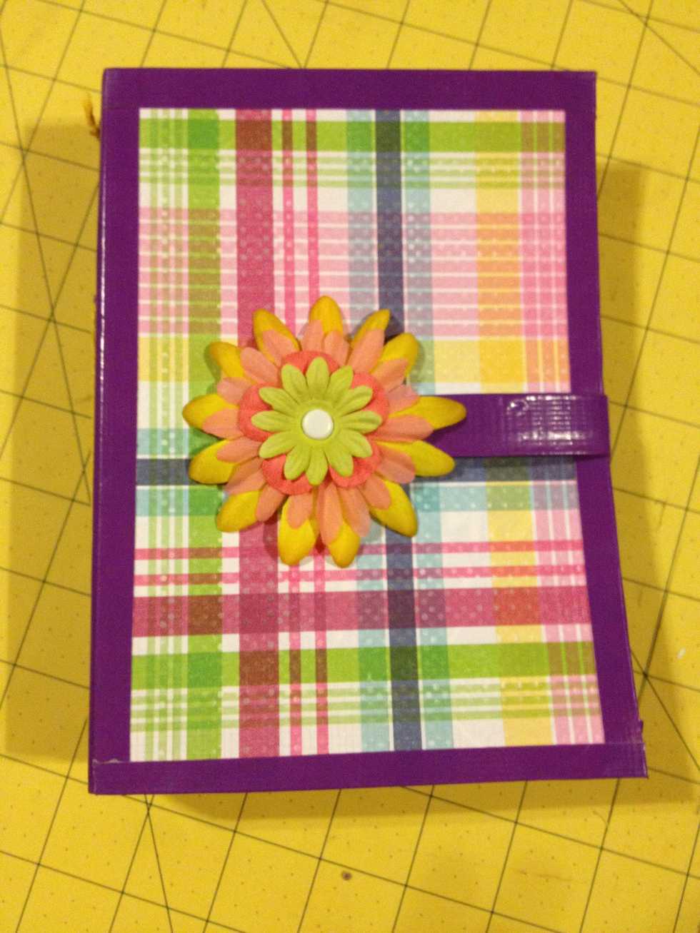 Take one of the scrap strips of paper and wrap it in duct tap for the closing strap. Glue it to the back cover.