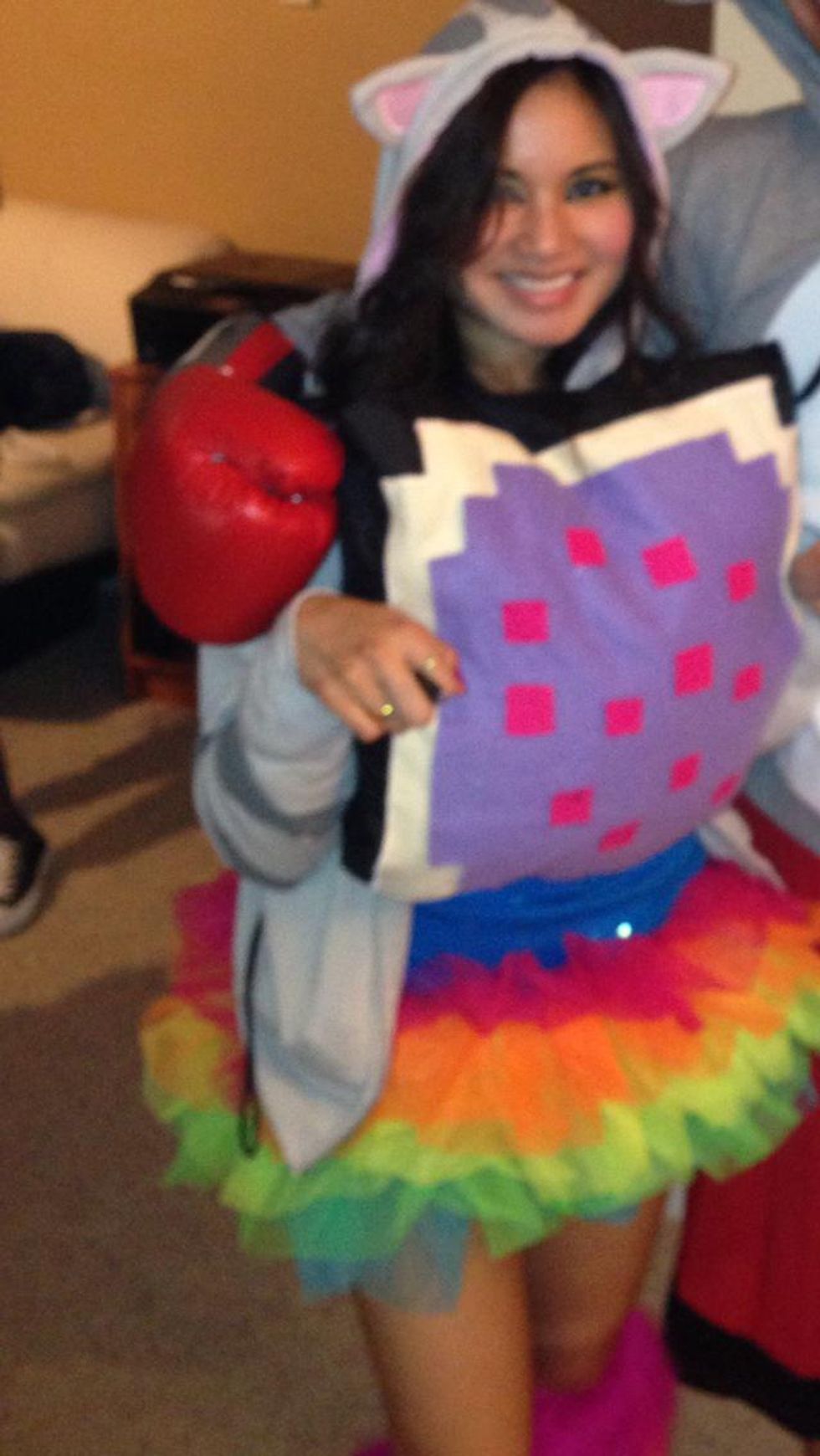 To save time - my friend found me on amazon a light up rainbow tutu / & rainbow leggings - a cat hoodie close enough to nyan - and I got a sparkle tank top from express then tada !!! U are nyan cat :3