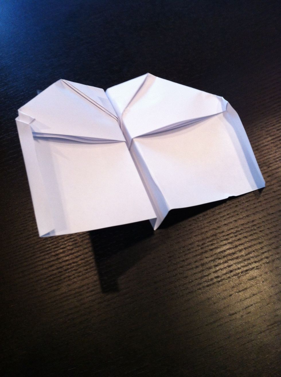Next fold the left wing down leaving a small grab hold spot underneath it. Then fold the right wing to the same position.