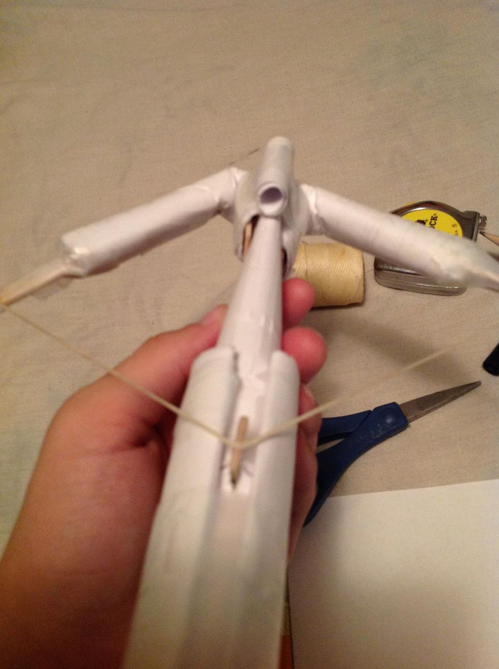 The next thing you will be doing is attaching your bow arms so you got to pinch down the one end of the main body tube.