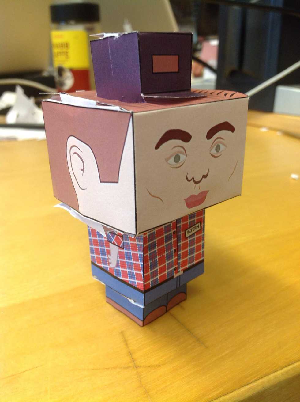 Put on the legs. Keep the intern on your desk. There is no need to be gentle with him. If you happen to take out your rage on the intern, just print another one out.