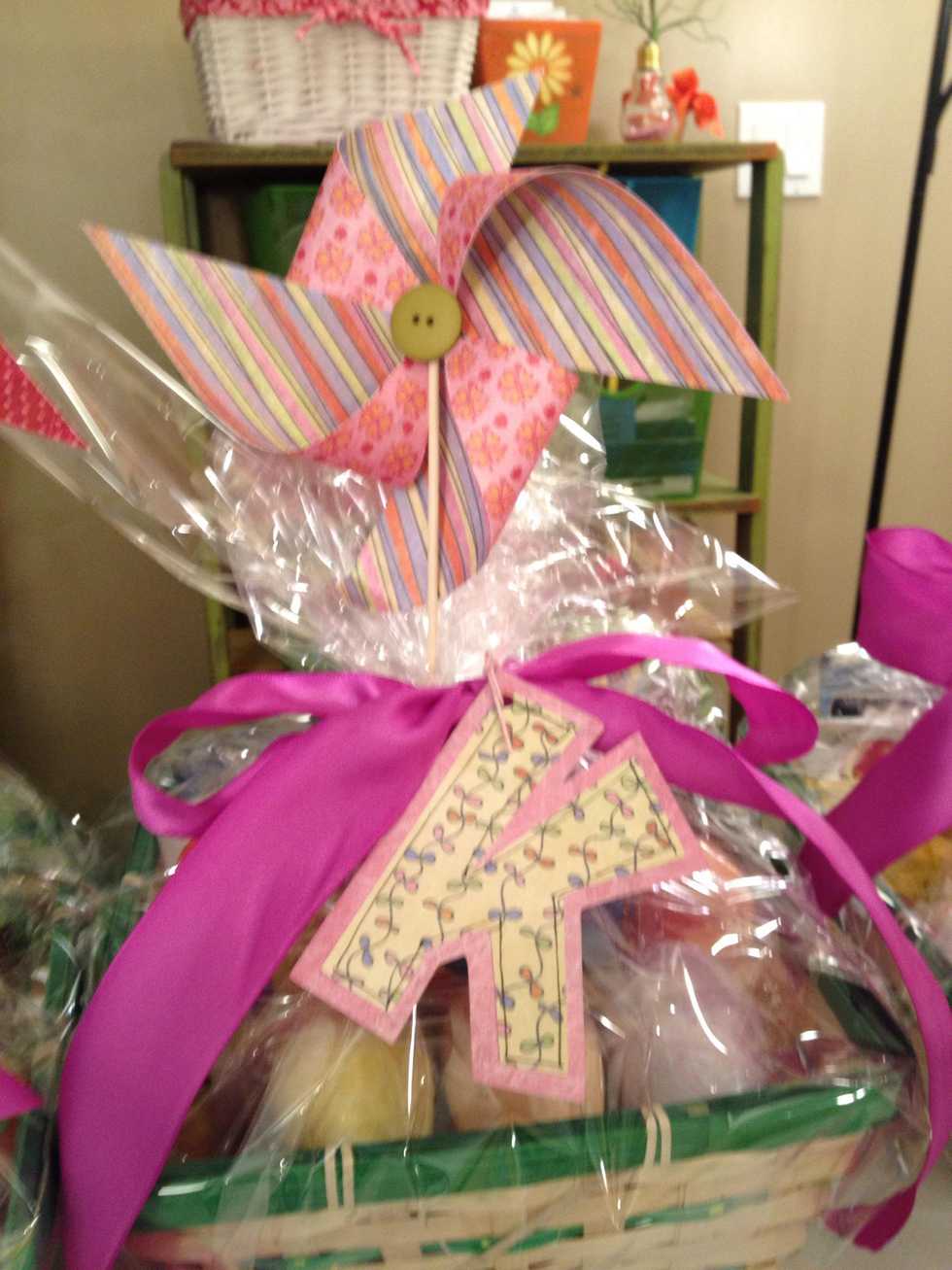 I attached my pinwheels to my kid's Easter baskets and added a large initial tag. The pinwheel makes it do much cuter! See more ideas on my blog. Littlemisssuzyq.blogspot.com