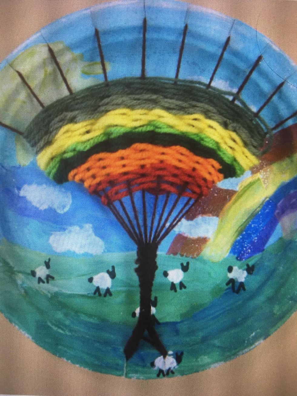 Making tree trunk: Take the end of the yarn (that you just pulled through the bottom right) & wrap it around the yarn at the bottom of the plate. Tug gently.