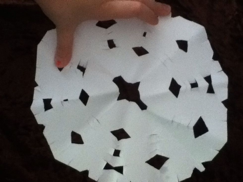 When you are done cutting some shapes on the cone open it to make a snowflake