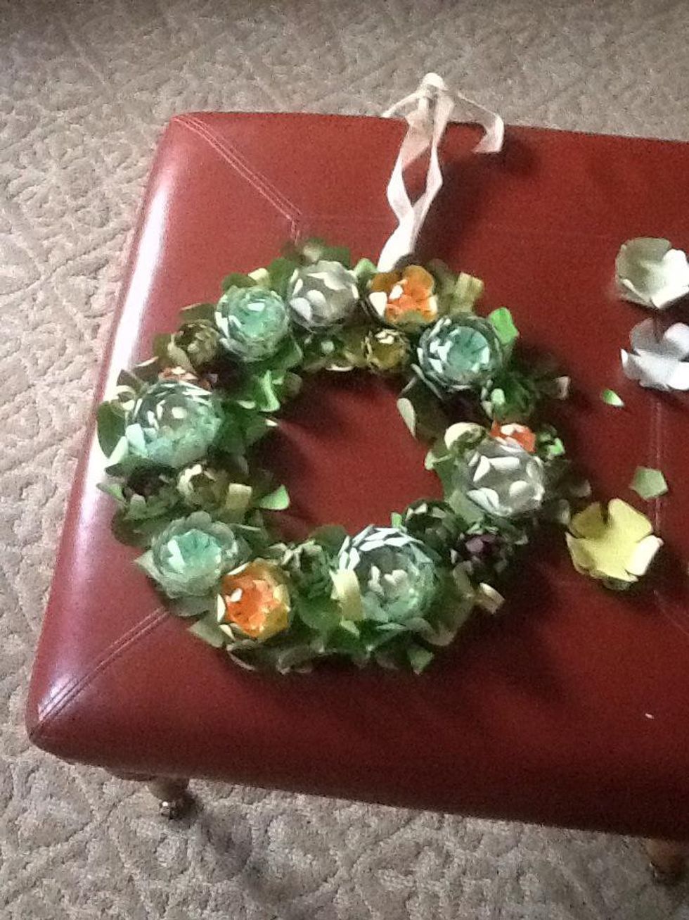 Now arrange your succulents on the wreath. You will have some extra fig and coral shapes hyper curl them, then put them in the wreath as well. Adhere them to the wreath with the foam squares .