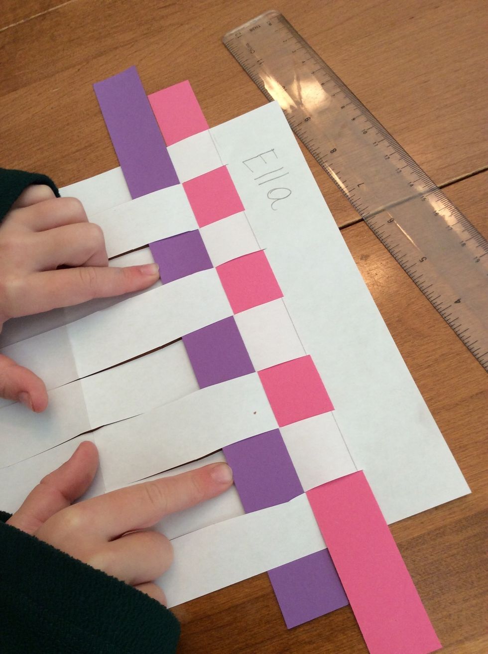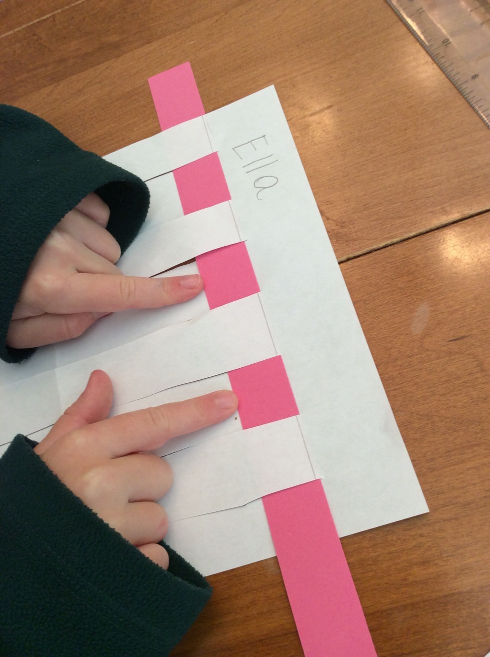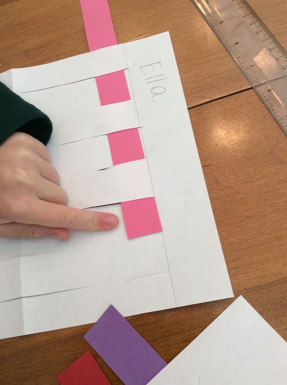I will begin weaving my new strip OVER the paper because I know that the opposite of under is over. This will make my weaving strong.