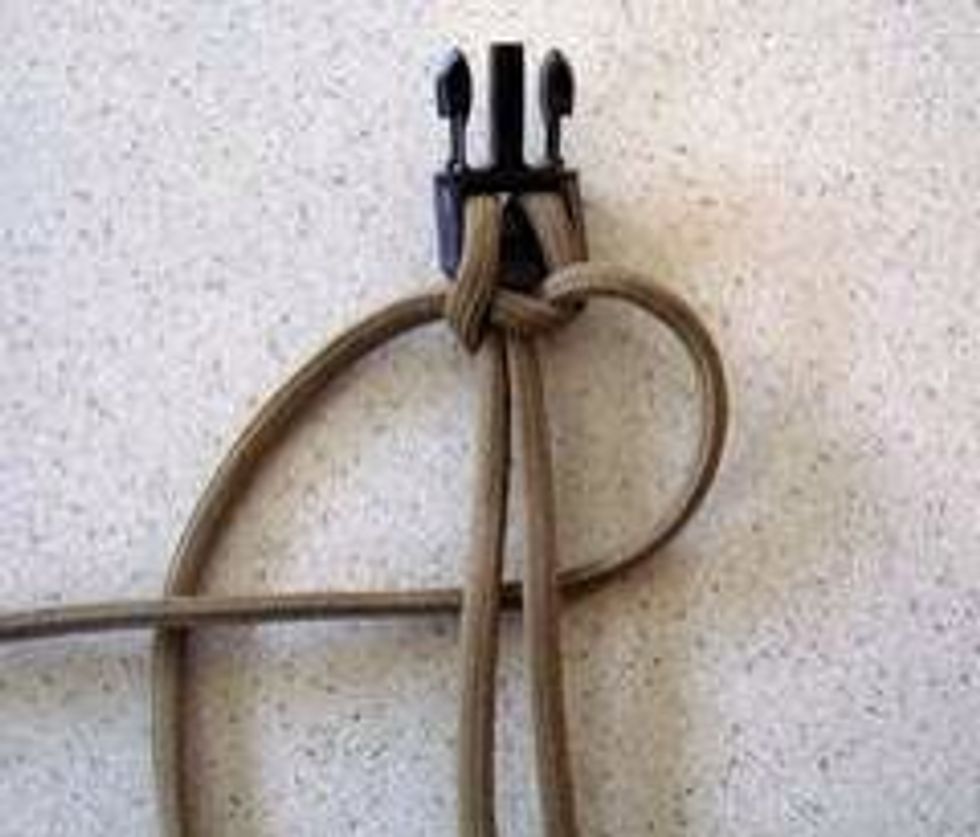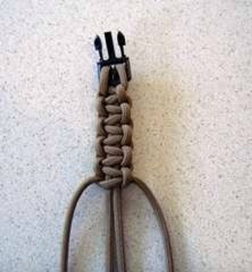 Take the shackle/buckle, and fold the rope in half. Feed the doubled rope through the gap.