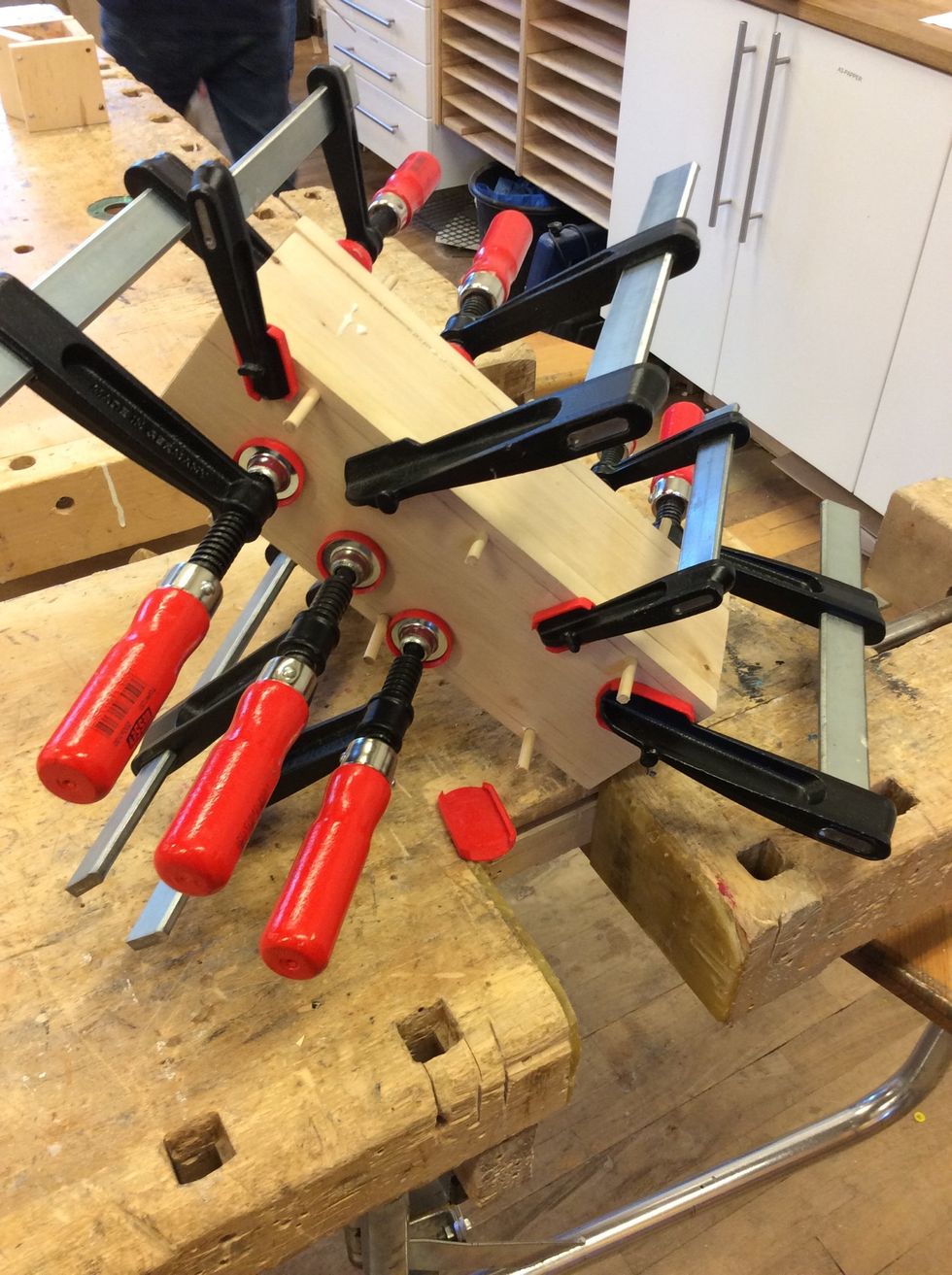 Spänn ihop lådan med skruvtvingar för att det inte ska bli glipor i lådan