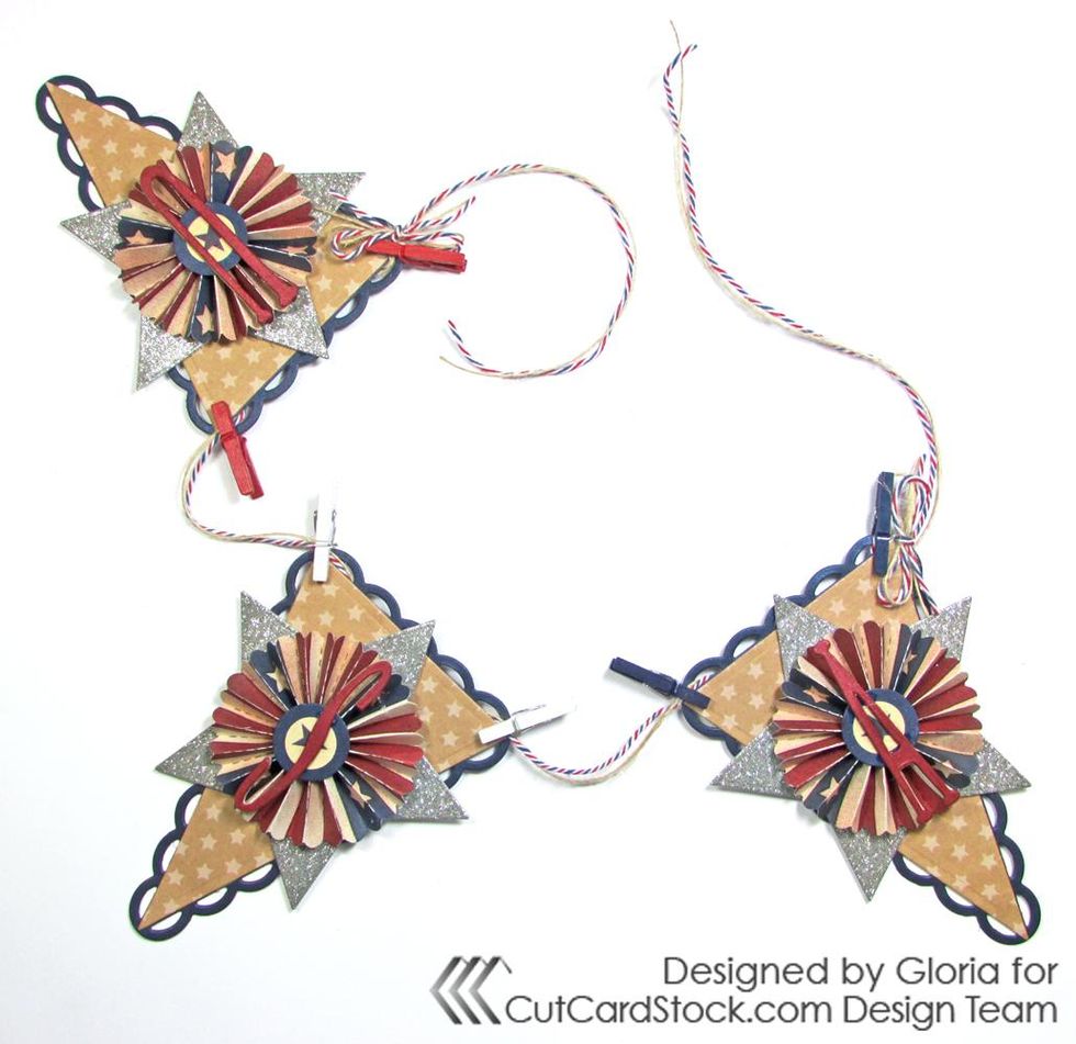 Use a Mini Rosette die to cut three strips of patriotic paper. Cut six, 3/4" circles from kraft and blue cardstock. Cut "USA" from chipboard and again from red cardstock.