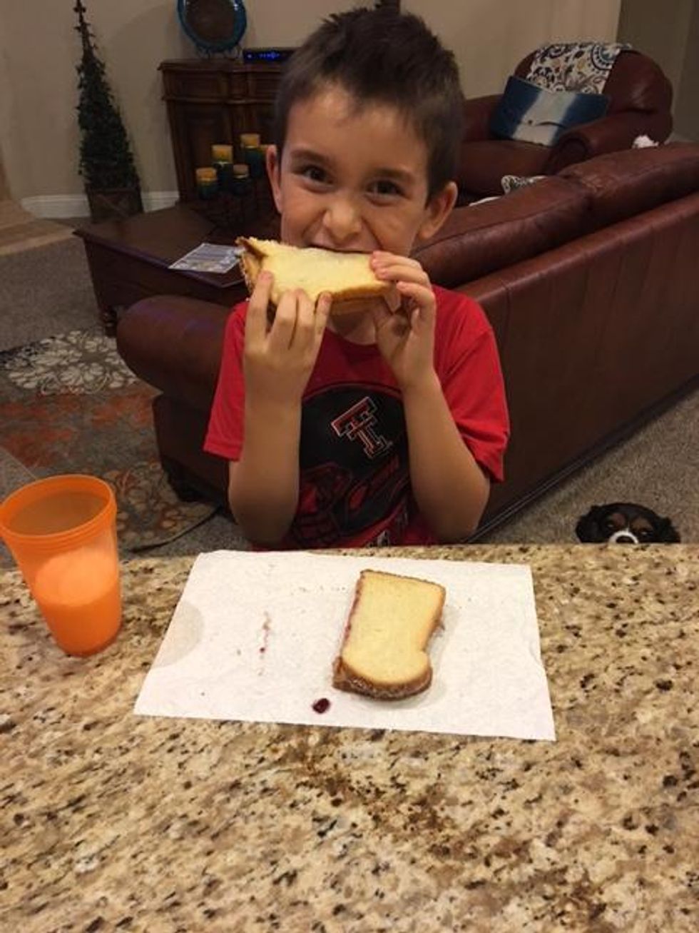 Then, place the peanut butter slice on top of the jelly. Place the peanut butter on top so the jelly does not fall off.
