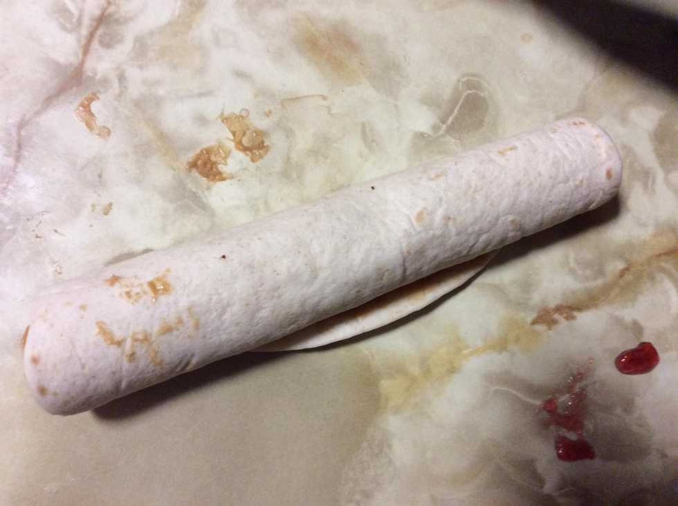 First put the peanut butter on itThen add the jellyRub the jelly on the tortillaBut put them on a different side of each otherThen start to wrap it upKeep wrapping itThere you goIt's done