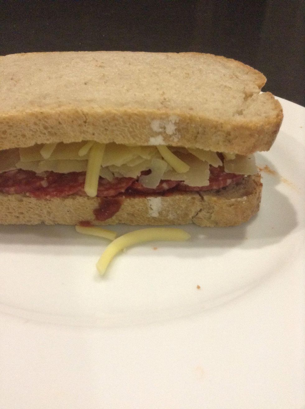 Generously put pizza sauce on one piece of bread.Cover with pepperoni slices.Add cheese.Close the sandwich. Can be eaten cold or toasted.