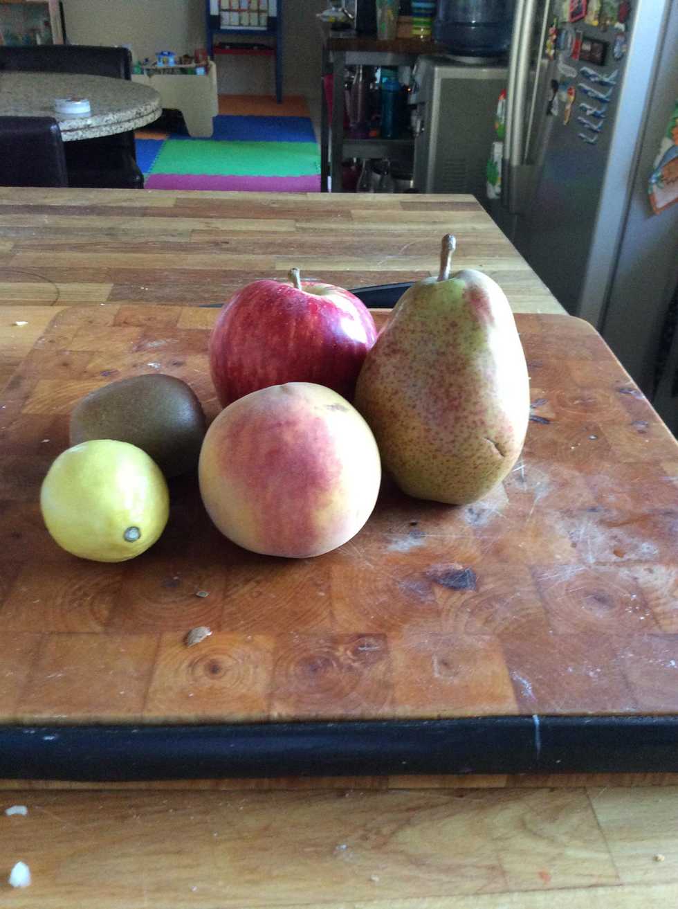 After, you need to put your kiwi on the bottom and peach on the top