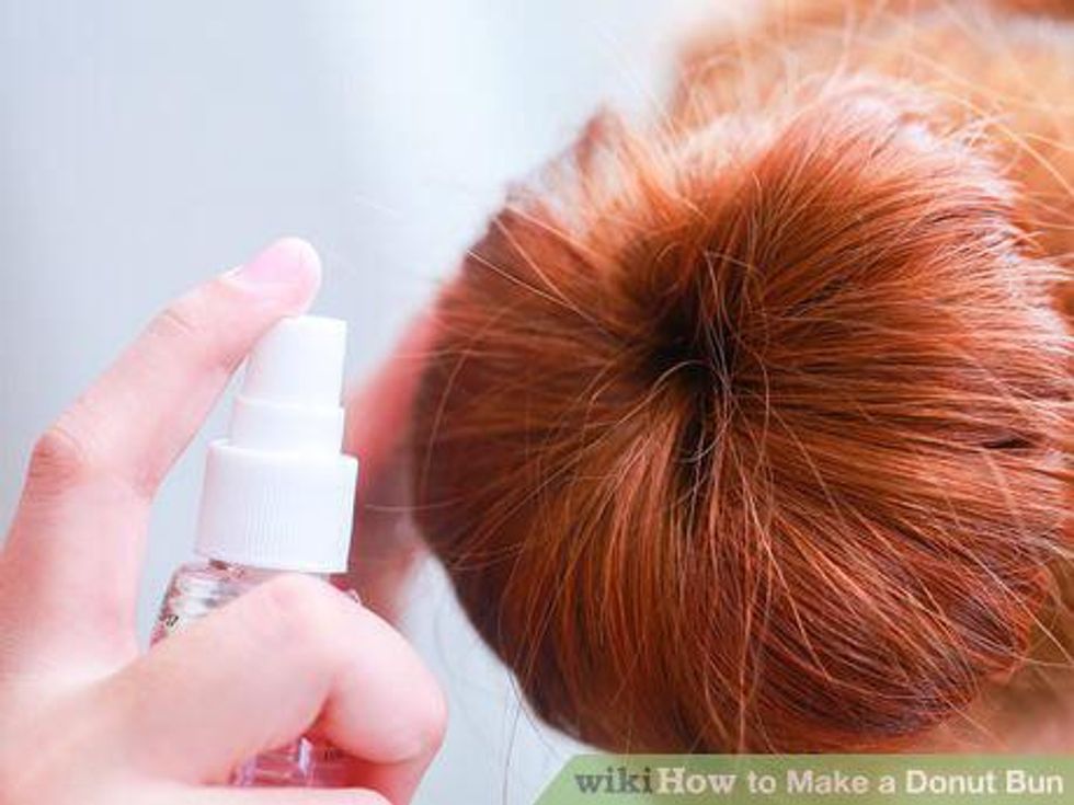 Use bobby pins and hairspray to hold it in place. If the donut seems a little loose, pin it against your head using a few bobby pins. Use firm-hold hairspray to keep your hair from getting messy.