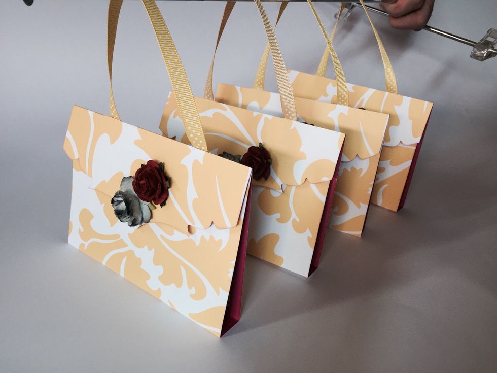 Cut 2 slits of 0.5" on the flap end of the paper so as to slit the grosgrain ribbon through as a "handle" of the purse.