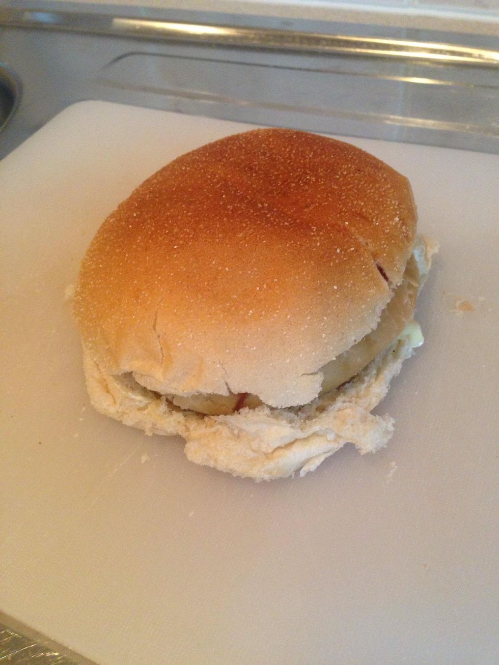 While the pie is heating, open and butter the roll. Be generous with the butter. Should note that this is a soft morning roll, but you can have a hard one if you're so inclined. Oh myyy