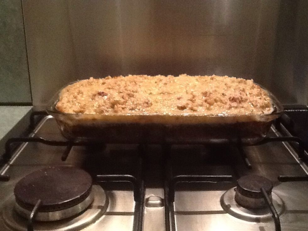 When your cake has come out of the oven, pour on topping and carefully spread while cake is still hot (use oven mitts to take cake out of oven)