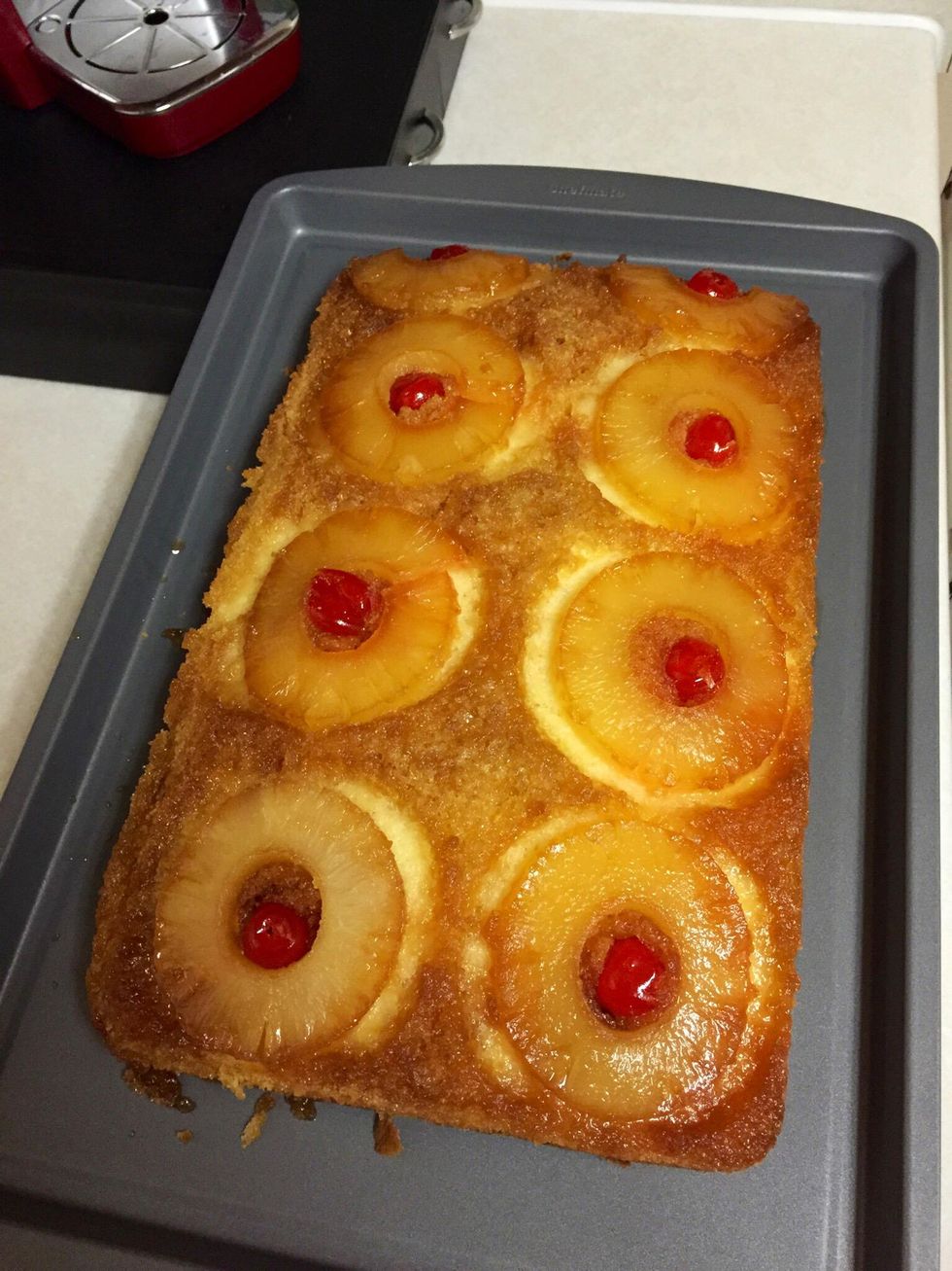 Make the yellow cake batter as directed except replace the cup of water with the pineapple juice from your canned pineapple slices. Don't do this step if you got pineapples in syrup.
