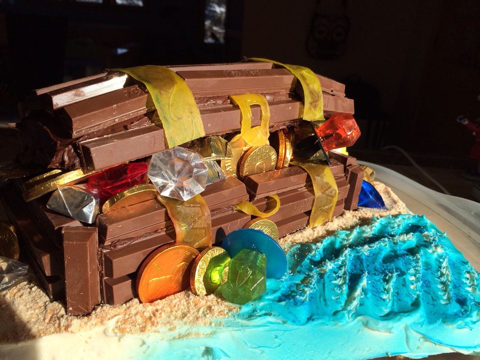 Add some treasure inside. Place a row of centered Kit Kats on the lid.
