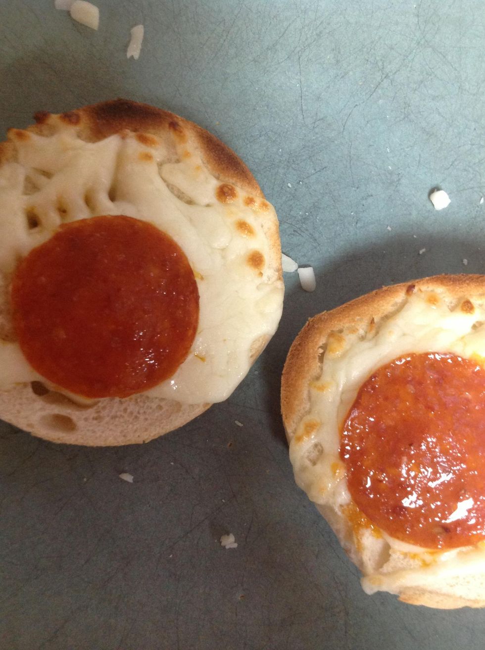 Mini BagelsAdd mozzarella cheeseThen add as many pepperonis as you wantPut them in the toaster and click onLet them cook until the Cheese is meltedTake them out with a fork so you don't get BurnedEat away!!!!!!