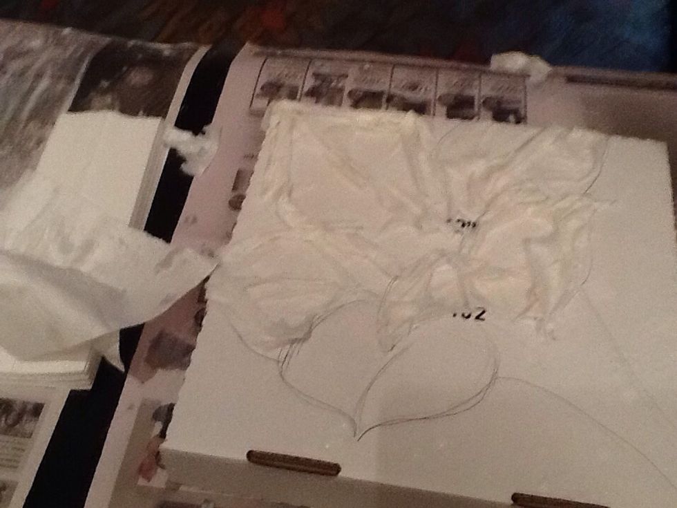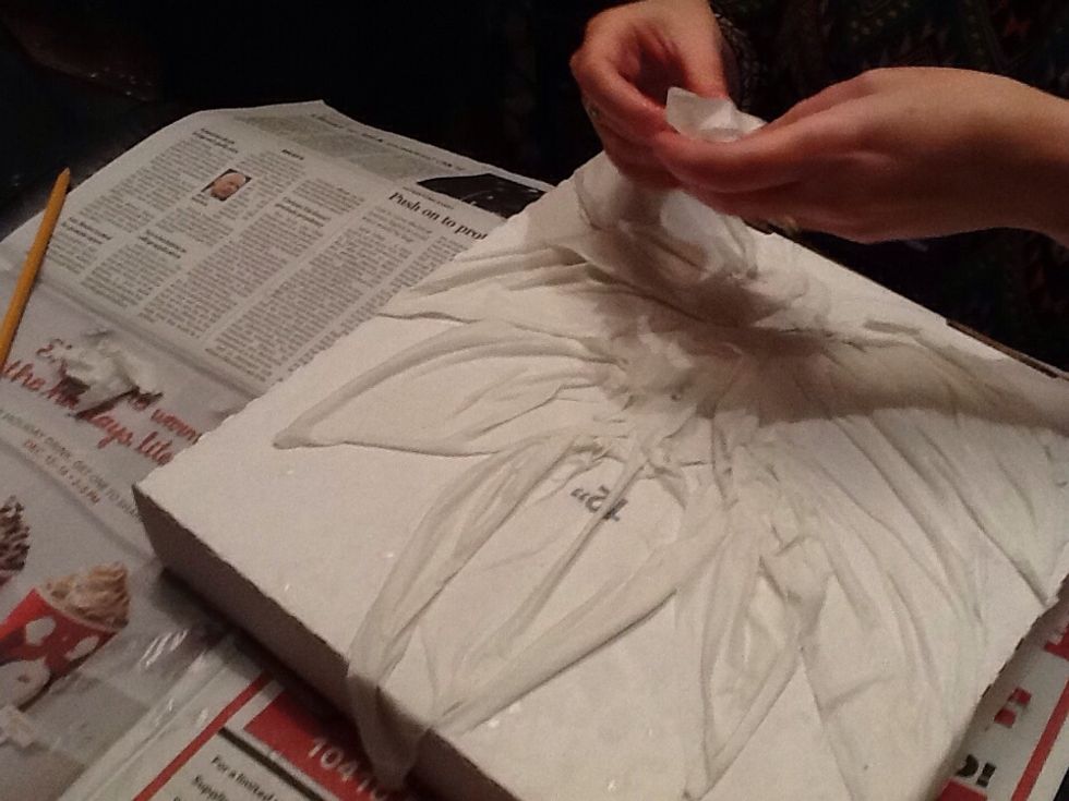 Dip your paper towels in solution of 1/2 water and half glue. Then begin building the texture. Use the ridges of the paper towel to create texture and movement.