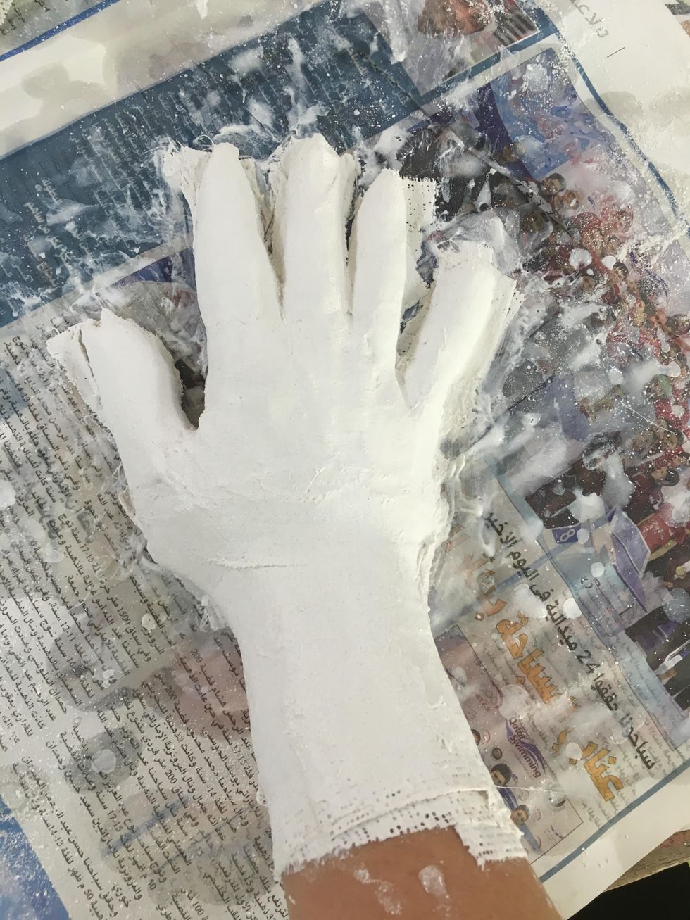 You now have a plaster cast of the top of your hand. Let them dry until Art class. We will paint them in class.Clean up your mess!