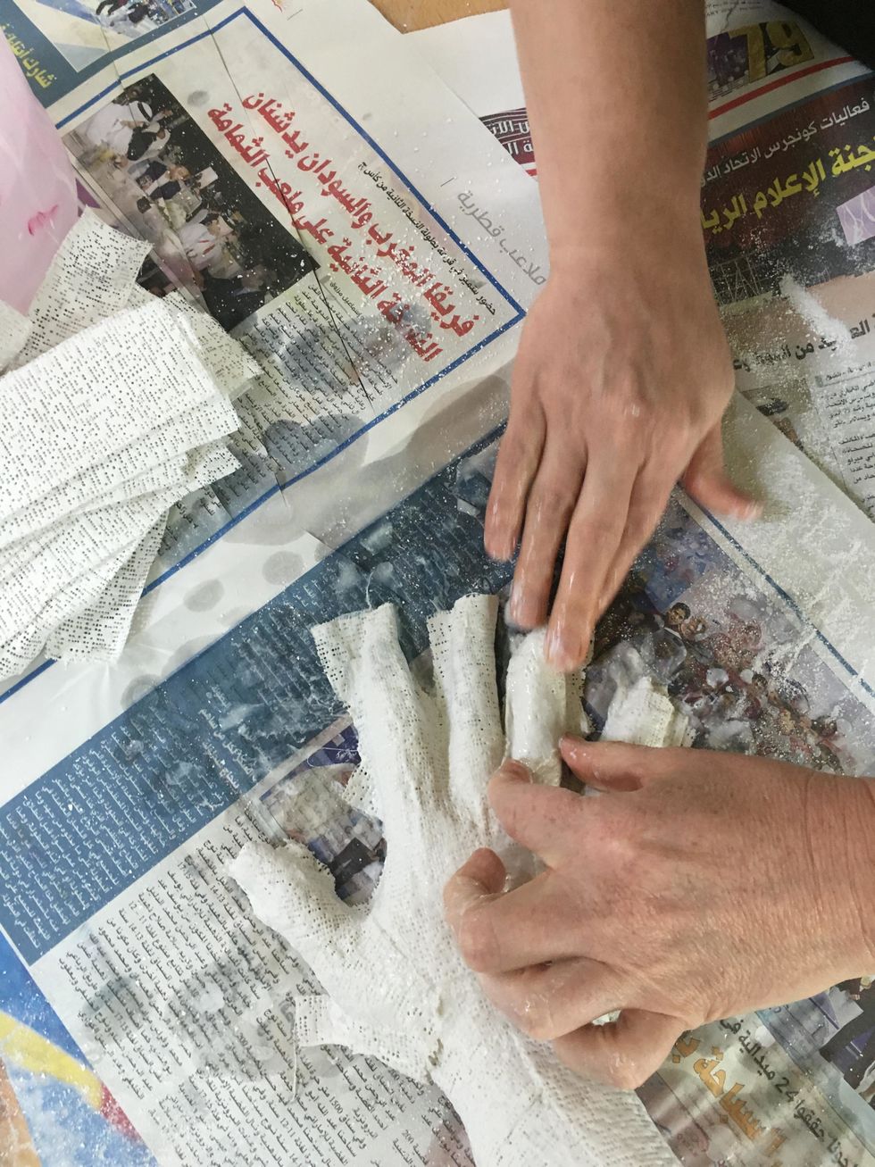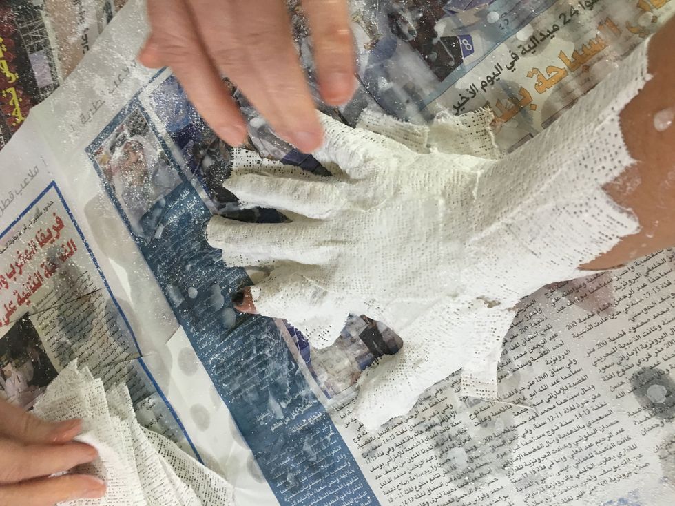 After you have 2 layers of plaster, let the hand model stand still for about 5 minutes to dry. Do not touch.