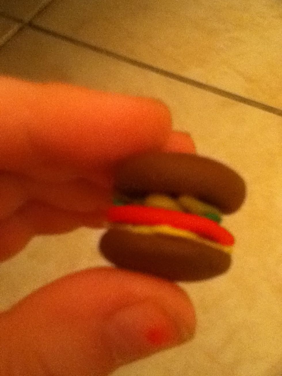 First take som brown playdoh and make 2 buns by putting it on a spoon then squeezing it down then removing it make sure that they are the Same size