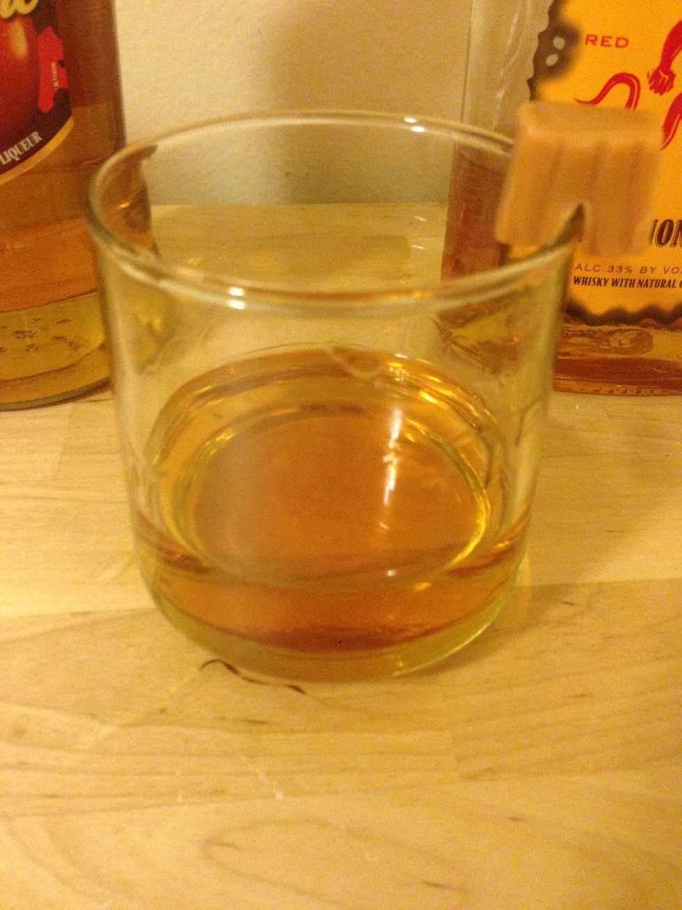 Pour 1.5 oz of caramel apple liqueur into the glass.