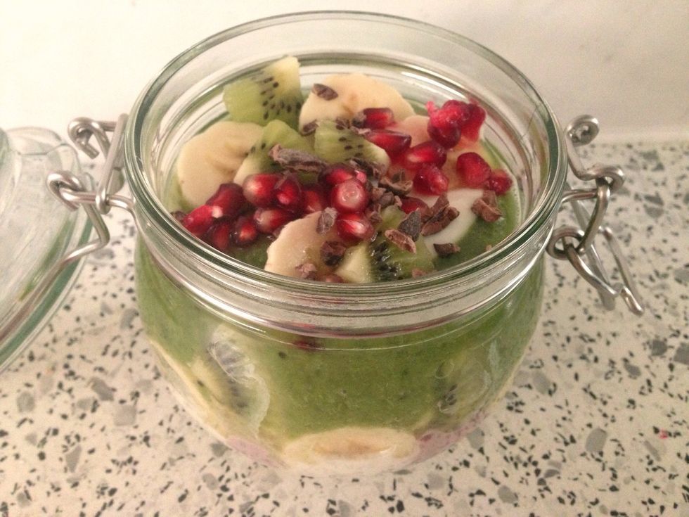 Add the wheatgrass smoothie with pomegranate seeds, kiwi, banana and raw chocolate on top!!
