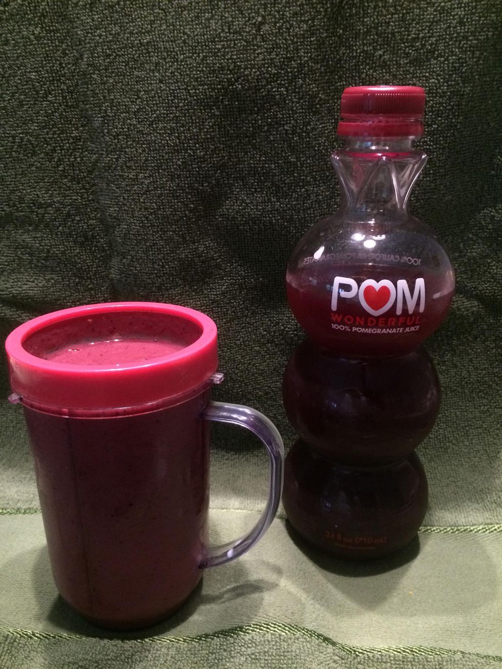 IngredientsSlice or break-up a banana into a blender cup.Add pomegranate juice to cover banana.Add yogurt.Fill remaining cup with frozen berries.Add Vitamin powder and top off with more pomegranate juice.Blend and enjoy!!!