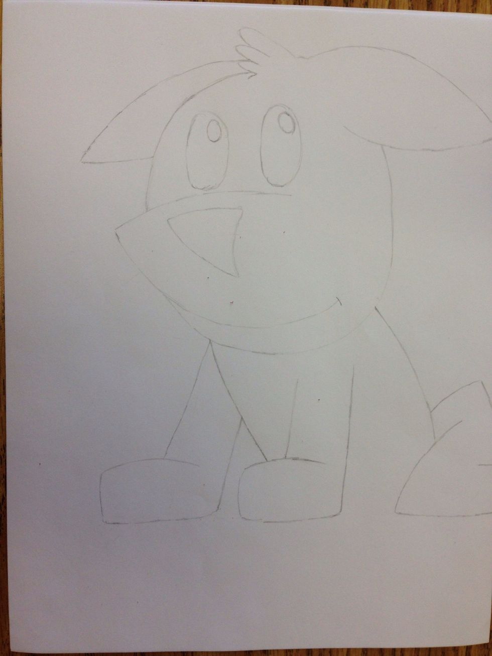 Step #6 Make the body by drawing two lines from head down to the bottom of the dog , than finish the front legs by making two lines to the middle of the body.