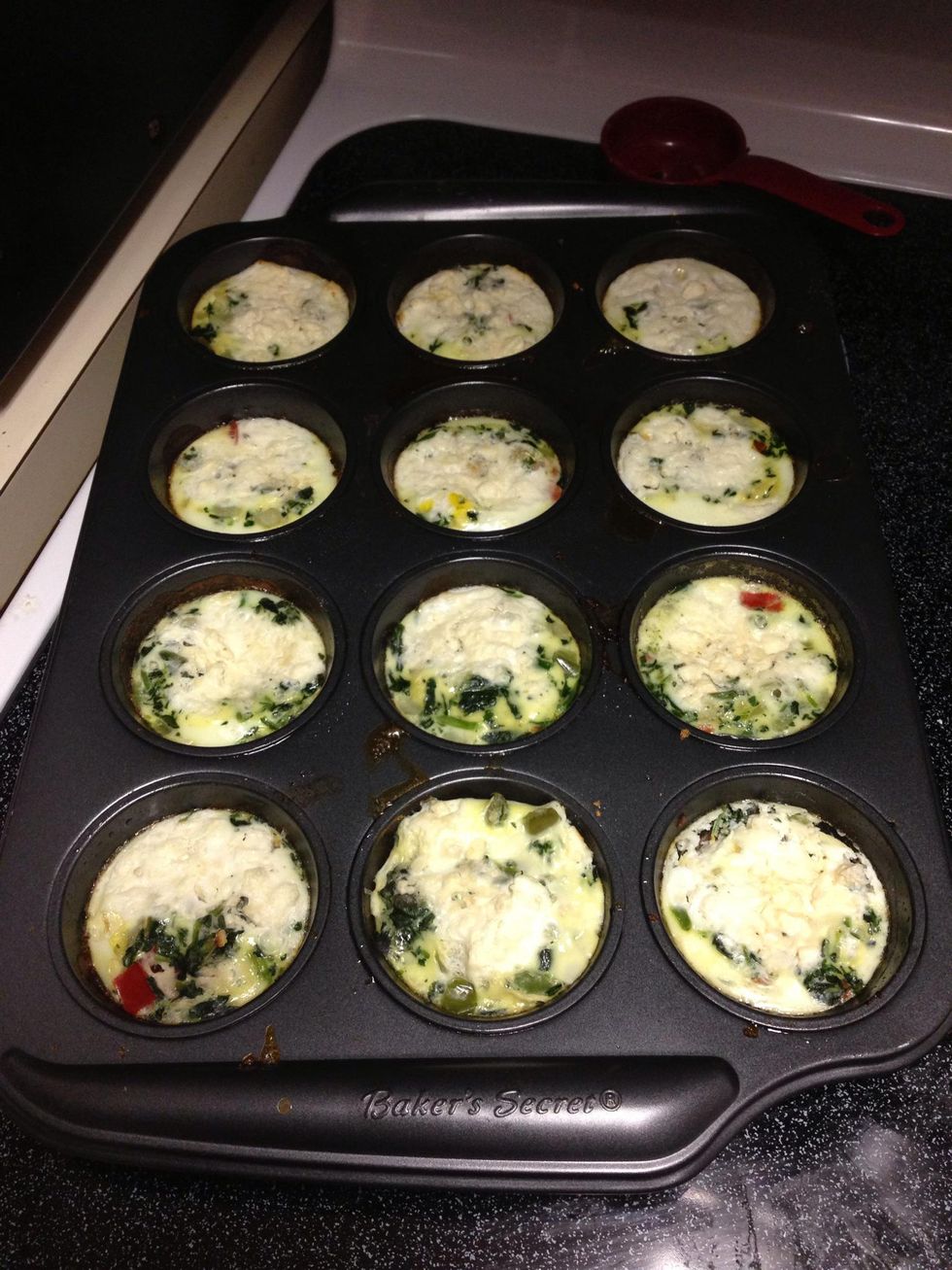 Whaaaa-llllaaaahhh! Portioned controlled egg and veggie quiches. About 100 calories per quiche. Women eat 4, men eat 6 for breakfast or snack! Any time of the day!!