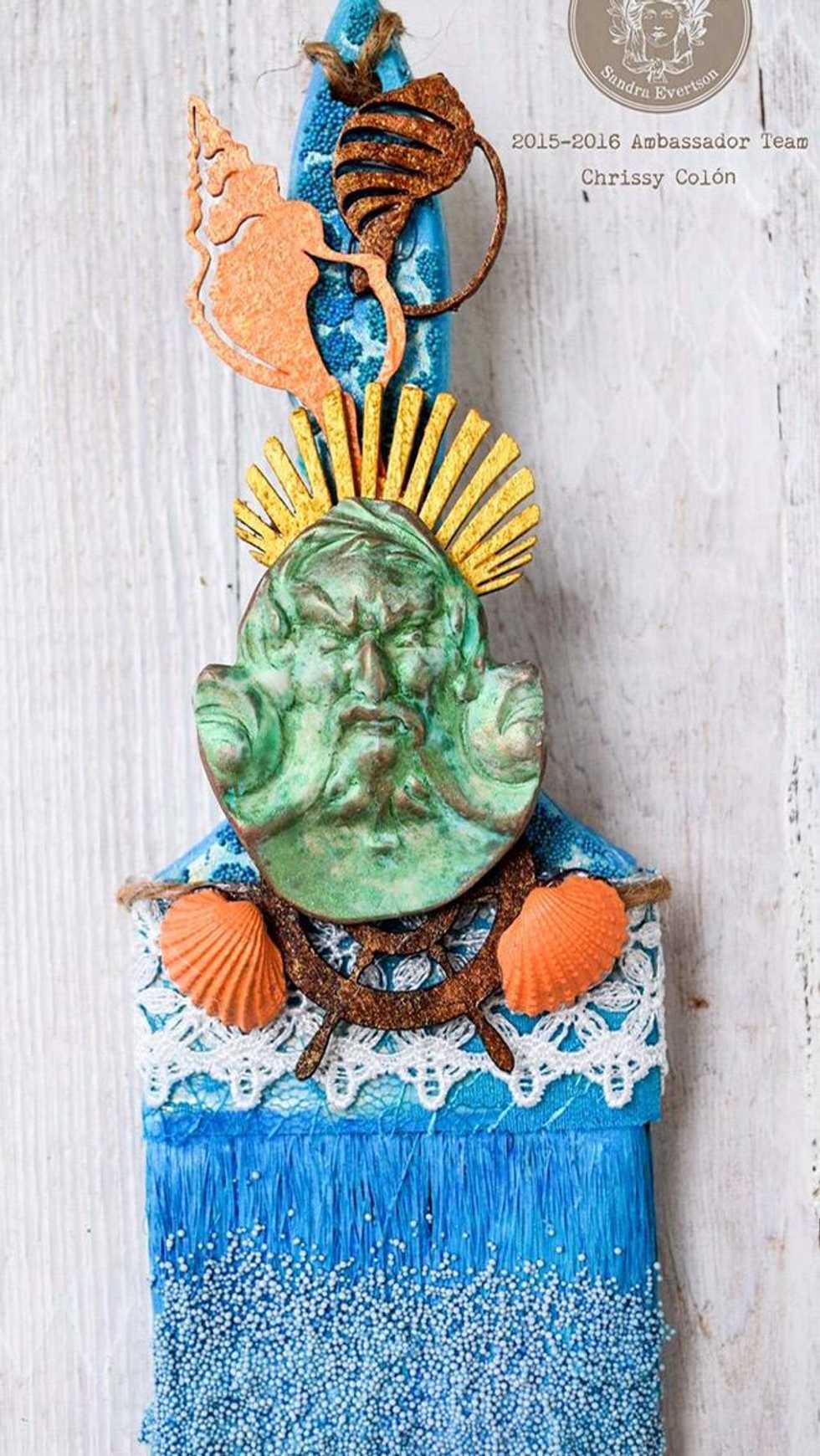 Apply VerDay copper paint and patina according to the directions. Set aside to dry . Once dry, use green mica powder and water to highlight the details on Poseidon’s lovely mug