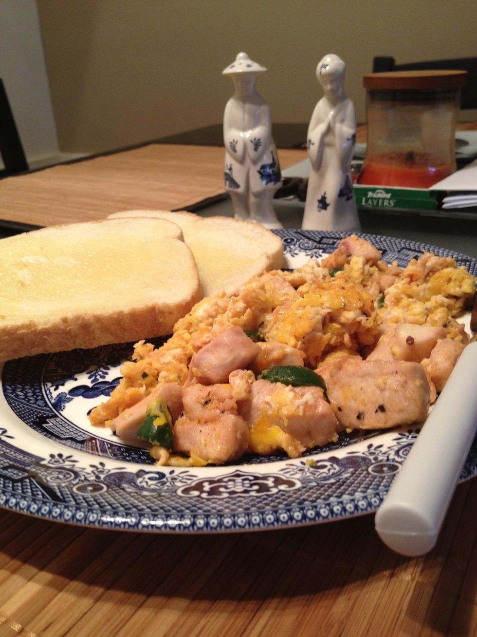 Pour the whipped eggs into the pan and let them cook till done. Make sure to mix everything around threw out the cooking process.