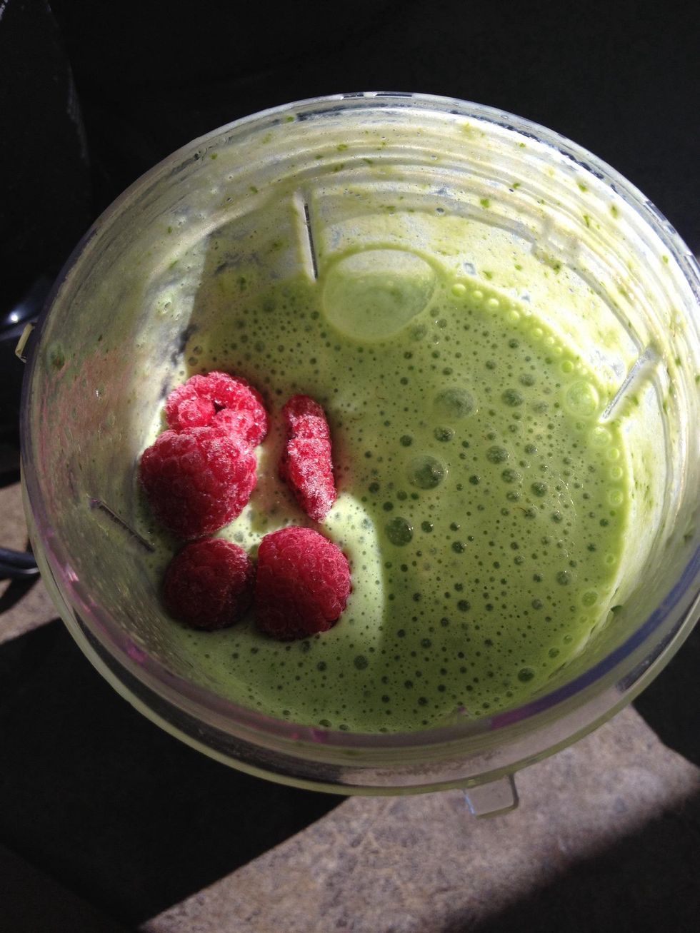 Grab the frozen fruit you chose. I added mango, peach, strawberry and raspberries. Don't add all at once.