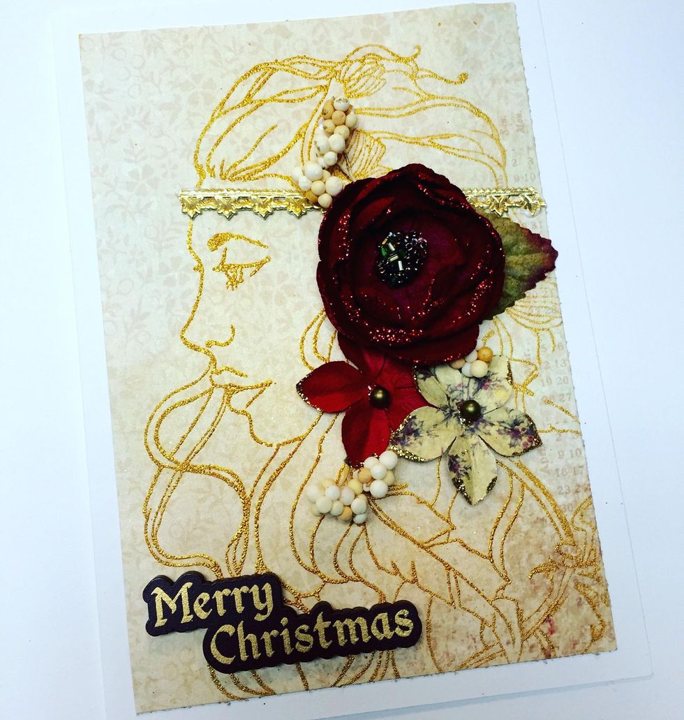 Bloom Girl stamp Versamark ink Sticky embossing powder Heat gun Cardstock Patterned paper Relics and Artifacts Dresden trims Flowers Gold mica powder Wood title