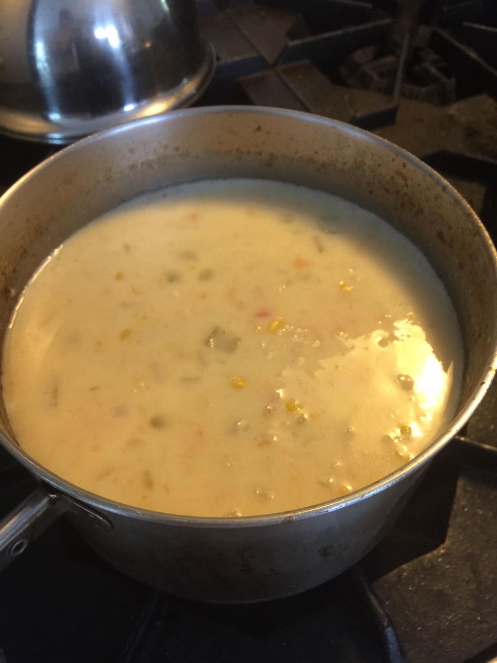 Lightly mash the potatoes and carrots. This will help thicken the chowder. At this point you want it to be on the thick side.