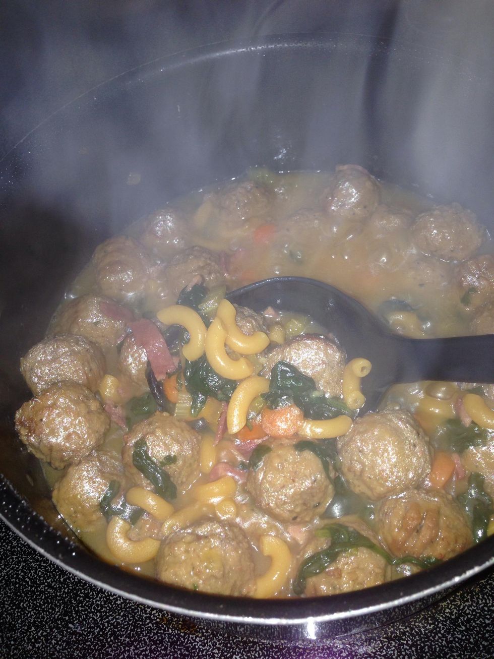 Add your Spinach. πTip: Spinach cooks fast, so add after you've taste tested veggies and meatballs are cooked enough.