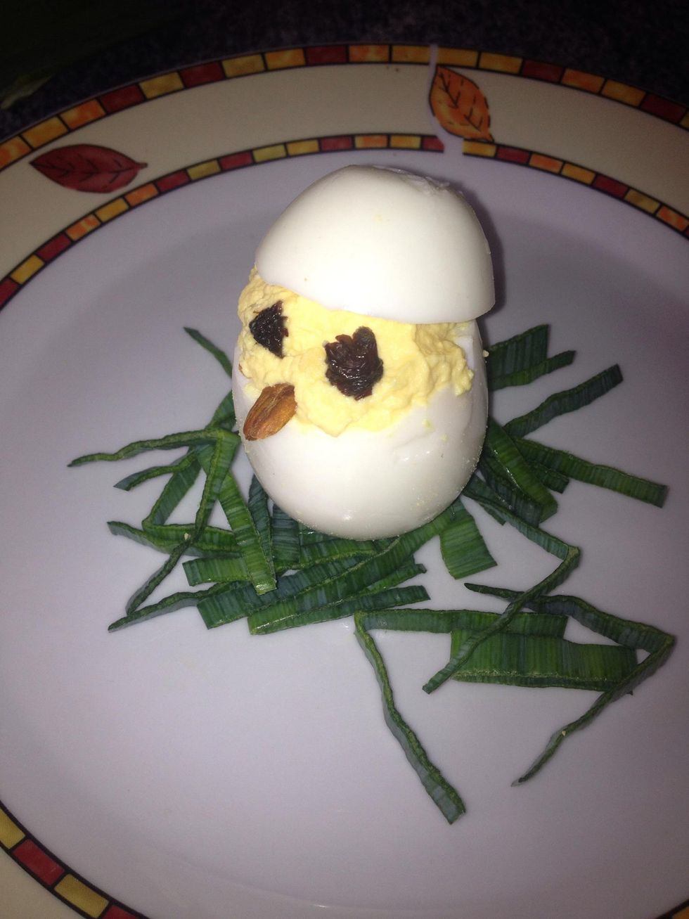 Spoon back the mixture use raisins for eyes and a nut for the beak and there you have it