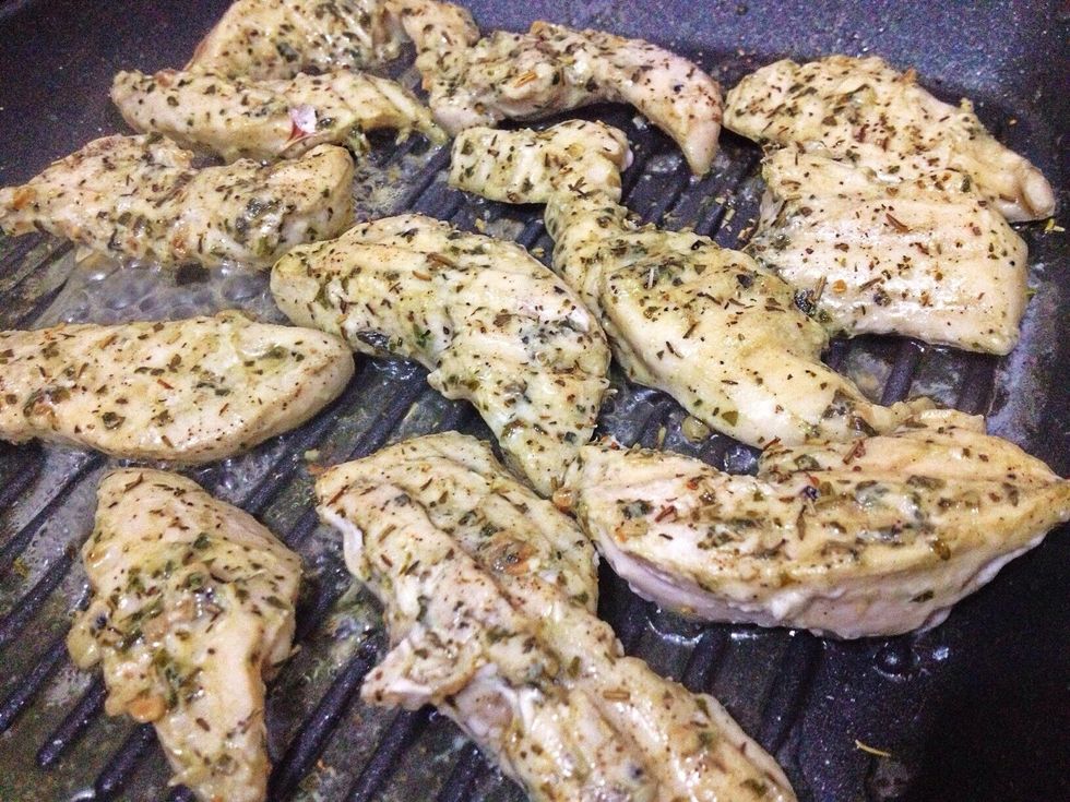 Once defrosted, marinate the chicken with your garlic, olive oil, salt & pepper and what ever spices you desire. I like (HOMEMADE) PESTO very much :) ...and add that to your chicken!
