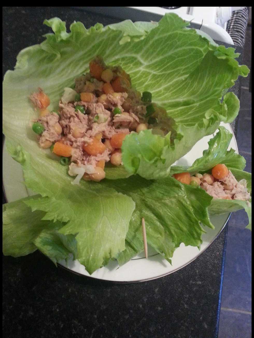Get a big piece of lettuce and add in your mixture of veg tuna and chickpeas. Stick In a cocktail stick to keep the contents gathered