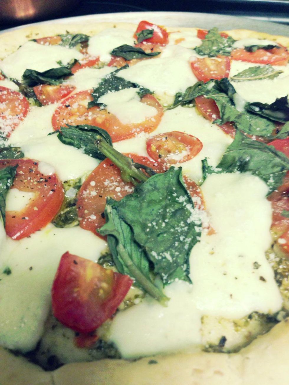 Spread some mozzarella cheese throughout the crust, keeping it nice and thin. Don't over do it or you'll lose the pesto taste.