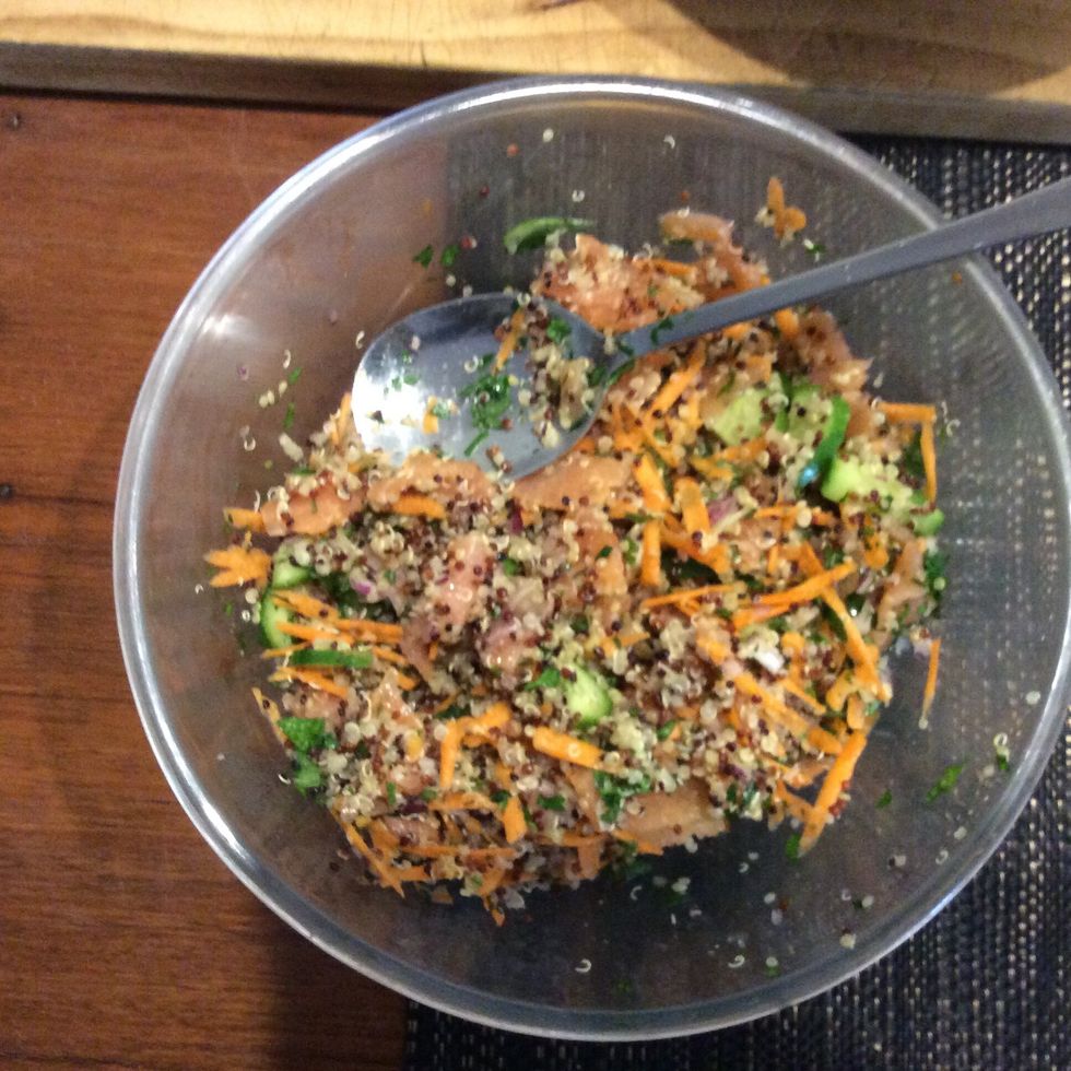 Ingredients: 140g of quinoa, 1 tablespoon of olive oil, 3 tablespoons of lemon juice, 400g of smoked salmon, 2 cucumbers, 1/4 red onion, 1 carrot, 1/3 cup parsley and 1/4 cup mint leaves.