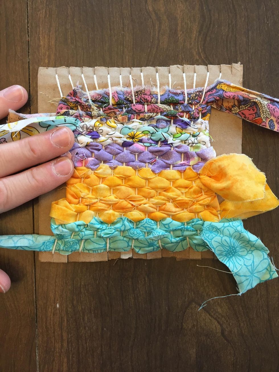 When you reach the end of the fabric strip, leave the tail hanging out and being weaving a new strip across.