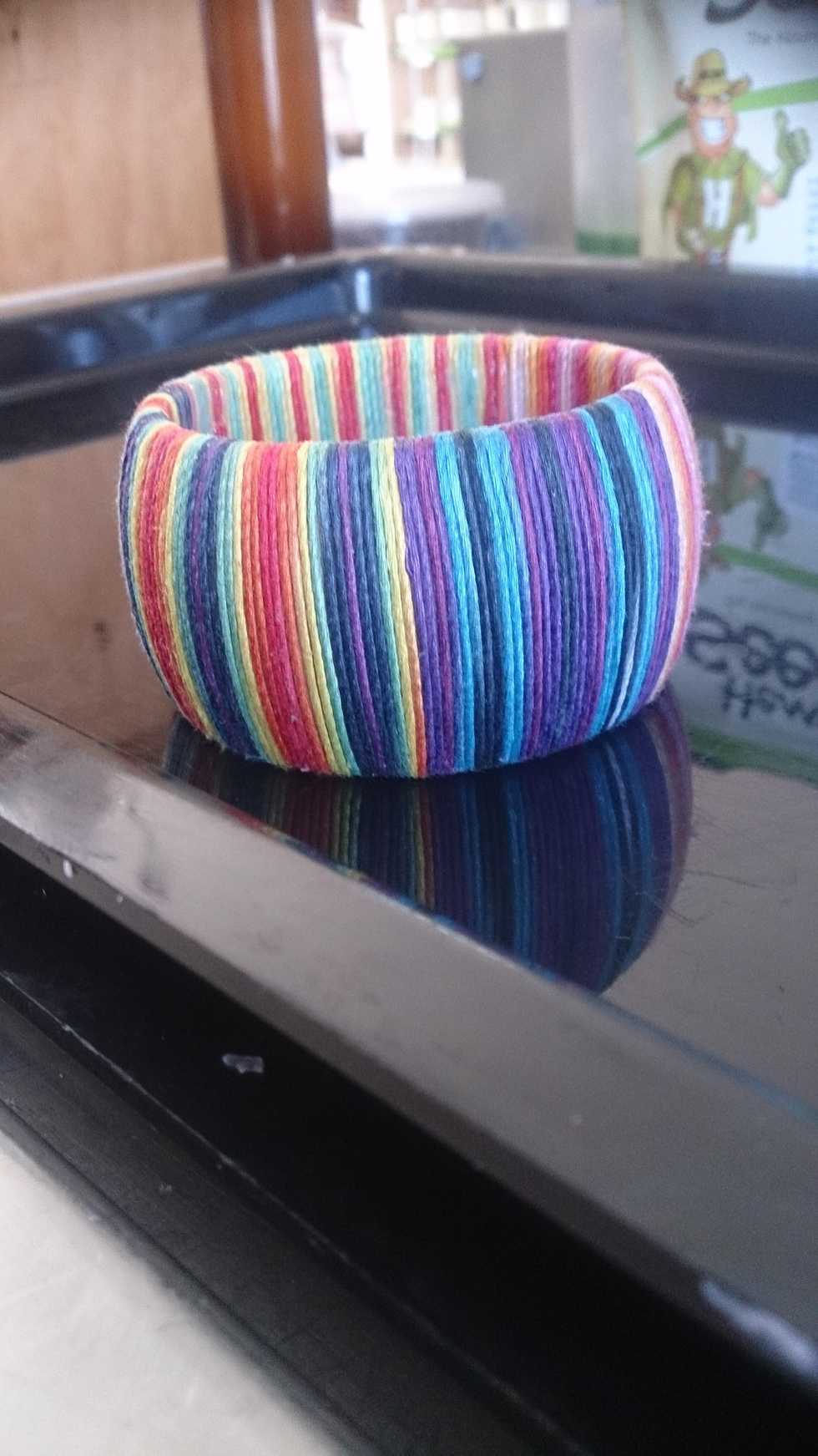 Now, begin wrapping the thread around the bangle. My daughter held the end of the thread with her finger so it could dry. As you go along, squish the threads together tightly.