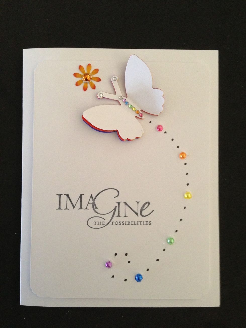 Attach rhinestones to butterfly and center to flower. Glue butterfly and flower in position at card top. Make pencil marks about 1/4 inch apart in an oval shape from butterfly to 1/2 inch from bottom.