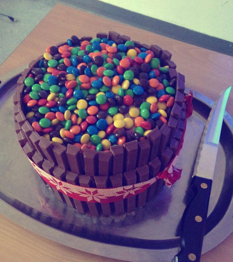 When the cake is cooled, decorate it with kit kat chocolates and m&m's.